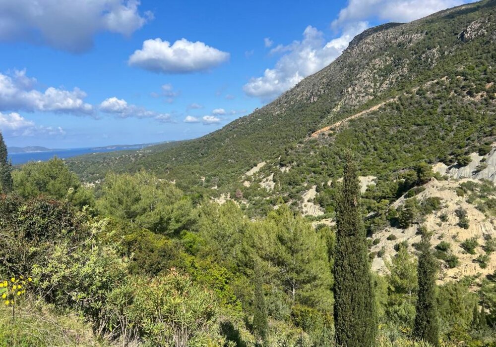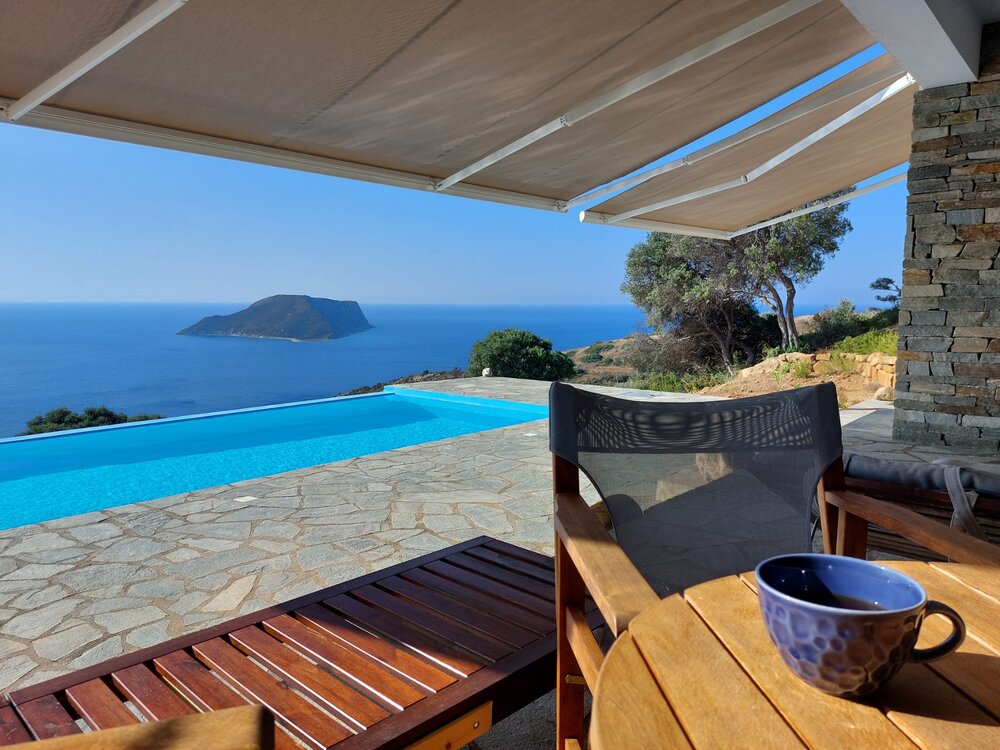 The house is situated in the heart of a Natura 2000 area spanning thousands of hectares (11,200 ha of bird habitat and 122,900 ha of marine area). There are dozens of kilometers of hiking trails among the flower-rich meadows, scrubland, forests, and olive groves. The peace, tranquility, and natural beauty make it a unique spot for nature lovers and those seeking tranquility. Just 300 meters from the terrace, 160 meters below, lies the Ionian Sea, with the island of Venetiko to the southwest.