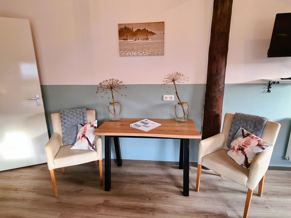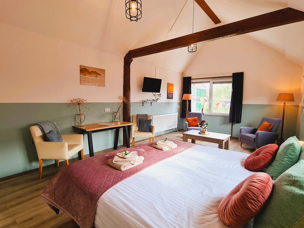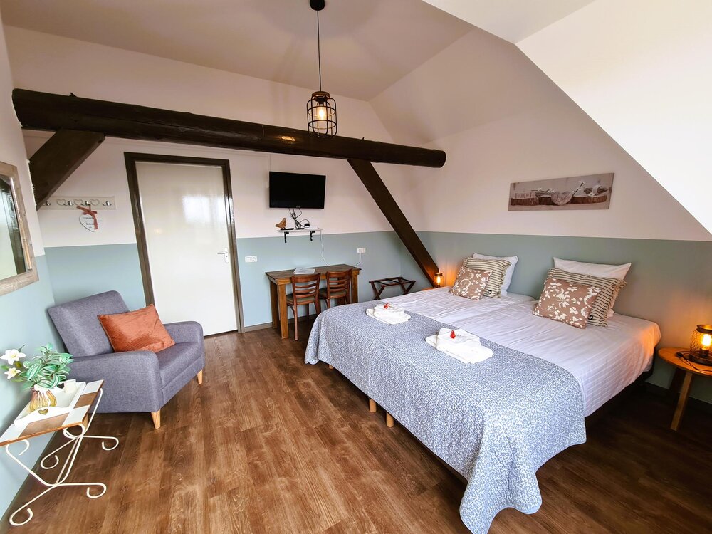 Discover the charm of B&B De Kan Hoeve. The 4 sustainable B&B rooms were built in 2014 in the Frisian stable. They are luxury hotel rooms with a sitting area, TV and high table. The B&B rooms are also rented out together as group accommodation. There is a capacity for 11 people divided over 4 rooms. All rooms have separate beds. In 3 rooms there are 3 beds and in 1 room there are 2 beds. All rooms are fully furnished.
